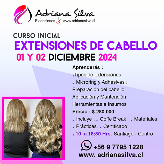 Curso PrincipiantesExtensiones de Cabello01 y 02 de Diciembre 2024Aprenderás :.Tipos de extensiones. Microring y Adhesivas :Preparación del cabelloAplicación y MantenciónHerramientas e InsumosPrecio : $ 280.000. Incluye : . Coffe Break . Materiales. Prácticas . Certificado. 10 a 18:30 Hrs. Santiago – Centro